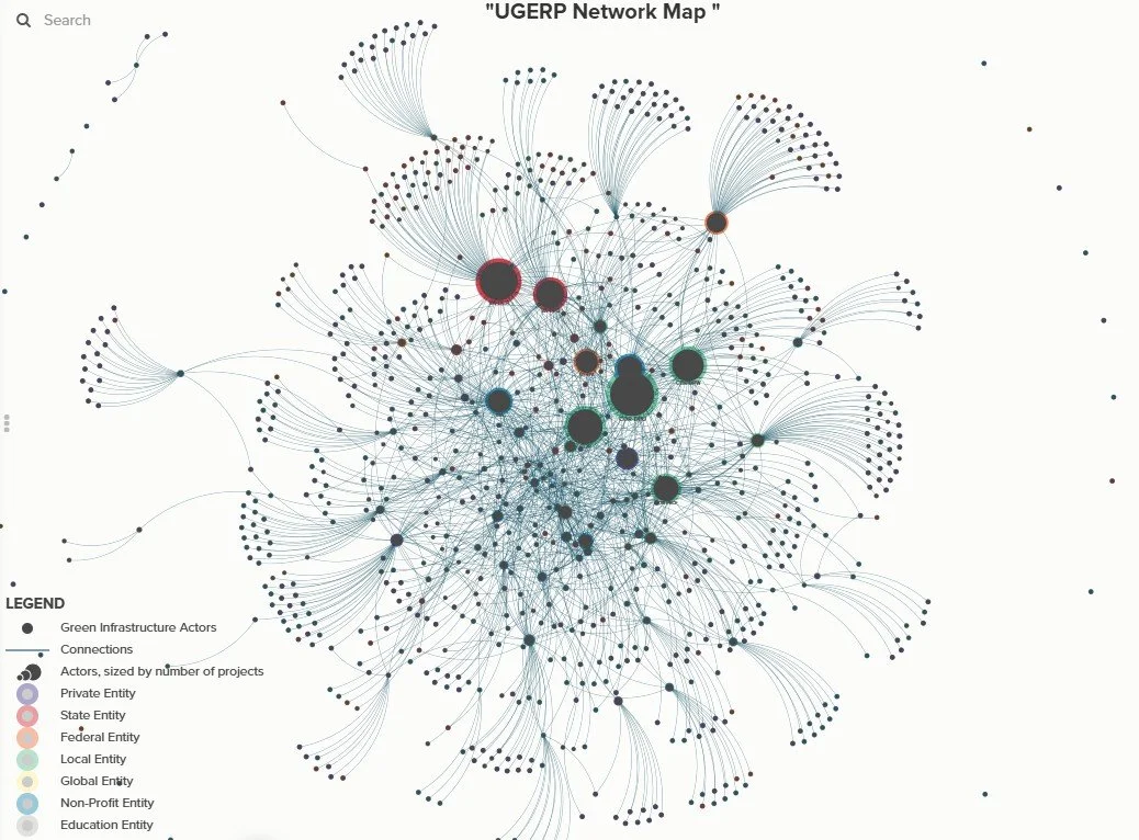 UGERP is an interdisciplinary, multi-stakeholder, community-focused project to map RVA's ecological capital (green infrastructure GI/GSI) and social capital (network of hundreds of affiliated actors and their interactions) (Syal, Ciminelli & Lewis, manuscript under preparation). These deliverables are produced to help these actors better coordinate and plan an integrated GI/GSI network to enhance urban resilience against multiple interrelated shocks: flooding, UHI, food insecurity, and more. The implementation partner is PlanRVA, regional planning agency for Central VA, that is currently completing its Natural Resources Plan, a hallmark regional planning effort by the agency.