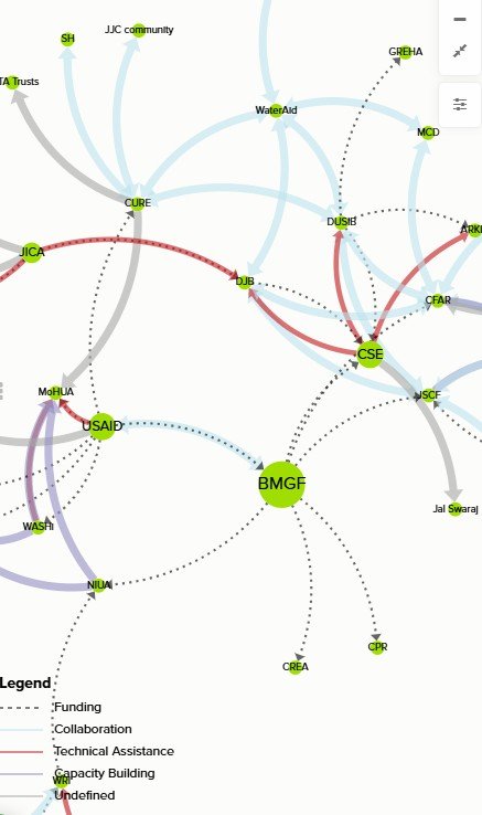 Nature-Based Solutions (NBS) like constructed wetlands could help us realize our vision of WaSH (Water Sanitation Hygiene) in ‘informal’ settlements, without compromising water quality in the adjacent stormwater drains and the river Yamuna that they flow into. My analysis of water quality and adjacent land uses around Delhi's drains destabilize the case that the poor pollute, identifying them as more the recipients of upstream pollution from ‘formal’ land uses (Syal, 2024). An institutional analysis of urban service access in informal settlements then showed how regulatory overlap cripples infrastructure/service providers, not just users (Syal, 2025), laying the groundwork for the need to map the network (ongoing) of the many international, national, and local actors dictating WaSH access and NBS deployment in 'informal’ settlements. This Social Network Mapping and Analysis of the major urban service chains (water, wastewater, stormwater, sanitation, solid waste, pest control, electricity) is not only consolidating the actions, roles, and interactions between hundreds of state and non-state actors, but also the hundreds of instruments (Plans, Policies, Legislations, Programs) guiding them.